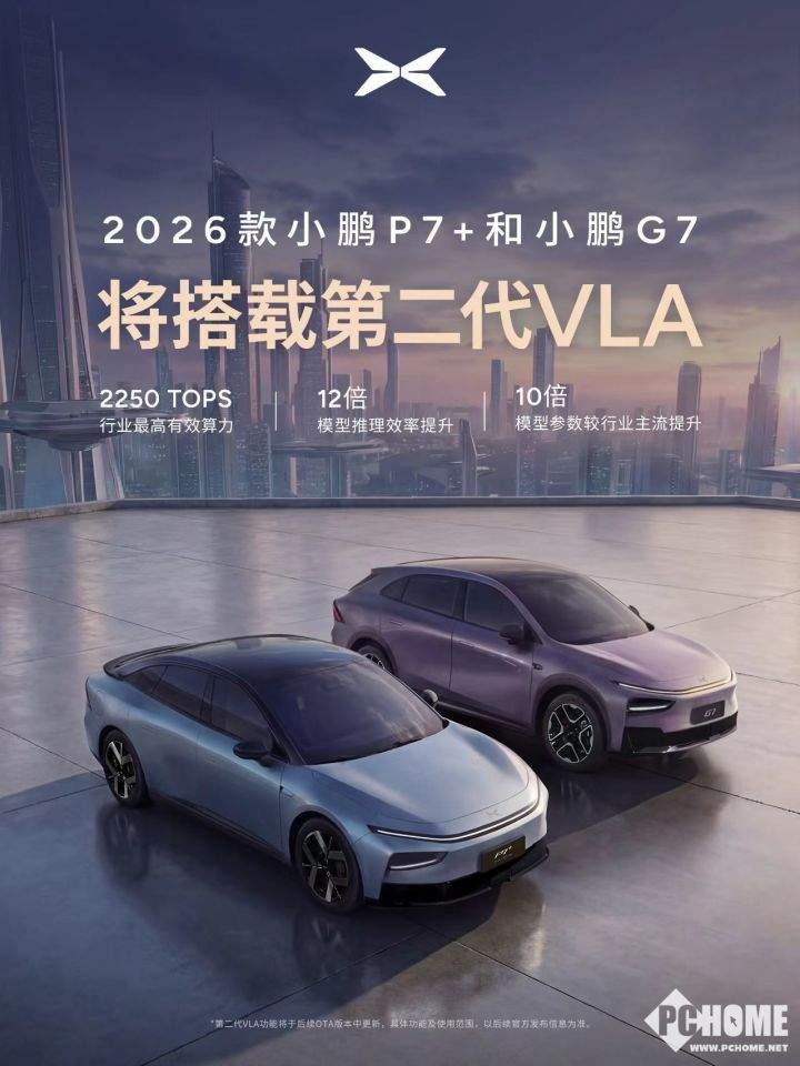 2025年12月31日,小鹏汽车正式官宣,2026款小鹏P7+轿跑与G7超级增程SUV将全系搭载第二代VLA物理AI智驾系统,核心标配三颗自研图灵AI芯片,以2250TOPS行业最高有效算力刷新中端智能车型天花板,新车将于2026年第一季度正式上市交付,同步开启全球36国同步开售布局。