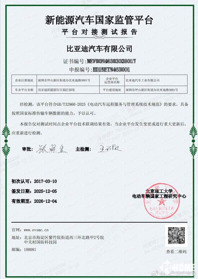 2025年12月17日,比亚迪今日宣布成为国内首批通过“新能源国家监管平台符合性认证”的整车企业之一。